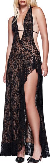 A daring side slit accents this figure-skimming halter maxi cut from intricate lace and fronted with a plunging neckline.