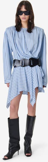 The Utenia Dress captures a sense of effortless Parisian poise with its fluid, wrap-inspired silhouette and architectural draping. Rendered in a crisp, light blue pinstripe, this mini dress features a conceptual handkerchief hem and voluminous sleeves, offering a modern, deconstructed take on classic shirting that transitions seamlessly from gallery openings to sunlit terraces.