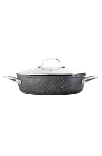 The Cuisine::pro® IRONROC™ 4.5 Qt Sauté Pan with Lid is ideal for shallow frying, braising, or reducing sauces in high volumes.