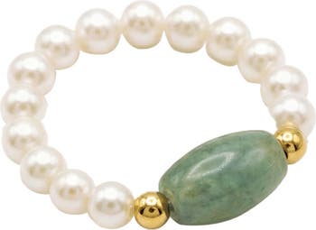 Featuring a beaded freshwater pearl stretch band and a delicate green oval jadeite as the center piece, Isa will bring real substance to your stack.