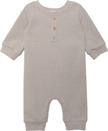 The Isaac romper combines functionality and style with its soft neutral-tone finish. Crafted with ribbed cuffs on the sleeves and legs for a secure fit, its three wooden buttons add a classic detail. Fabric Content & Care 94% POLYESTER 6% SPANDEX Machine Wash Cold | Line Dry | Do Not Bleach