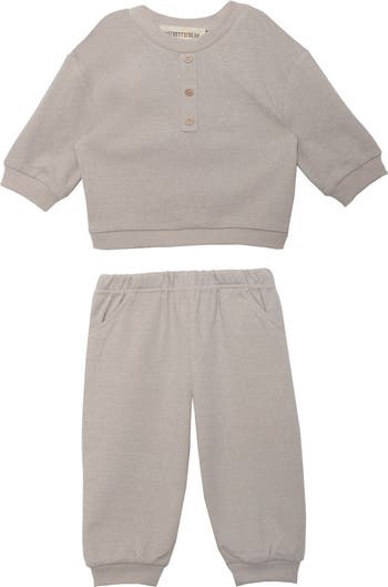 The Isaac two piece set for boys combines comfort and minimalist design. This light beige set includes a long-sleeved top with a ribbed round neckline, three-button details, and matching ribbed cuffs. The elastic-waist pants come with convenient side pockets and ribbed ankle cuffs for a snug, comfy fit. Perfect for casual play or relaxed days. Fabric Content & Care 94% POLYESTER 6% SPANDEX Machine Wash Cold | Line Dry | Do Not Bleach