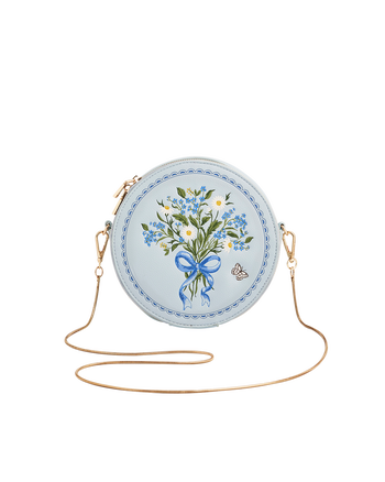 Express romantic nostalgia with the Isabel Floral Bow Blue Embroidered Circle Purse. Crafted in soft pastel blue faux leather, it is adorned with a delicate bouquet of daisies and forget-me-nots, brought to life with vibrant blue stitching. The detachable snake strap adds a graceful, flowing touch, making this circle bag a whimsical and sophisticated companion for every adventure.