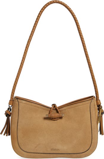 A braided shoulder strap and swingy tassels bring a boho-chic element to a baguette bag shaped from velvety calfskin suede.