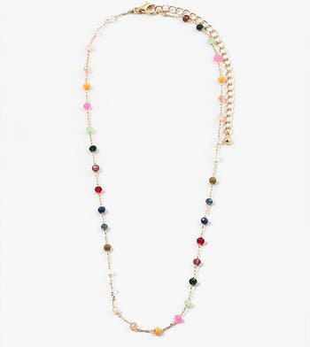 Mood-boosting beaded necklace with tiny gemstones separated but delicate gold chain. Bright, playful, and perfect for every personality…bold, take-charge, laid-back, or carefree!