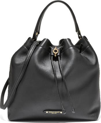 Decorative whipstitching and glinting logo accents highlight the voluminous profile of a rich leather bucket bag cinched by a drawstring closure and featuring an adjustable strap for on-the-go convenience.