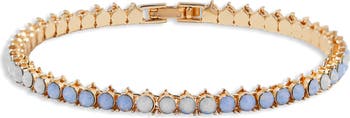 Misty blue cubic zirconia imitate the shimmer of opals on this glamorous tennis bracelet plated in warm 14-karat gold.