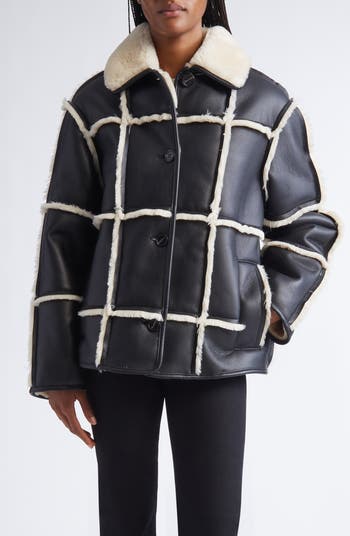 Tactile faux shearling lines and creates a dimensional grid on this boxy faux-leather jacket that blends Scandinavian minimalism with modern edge.
