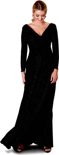 Make an entrance with our Isabella Maternity Gown in dramatic Glitter Black, a must-have for black-tie events and formal weddings. Designed with a flattering crossover neckline and full-length sleeves, the sultry wrap skirt drapes beautifully over your bump and splits to the knee allowing you to show off a little skin.