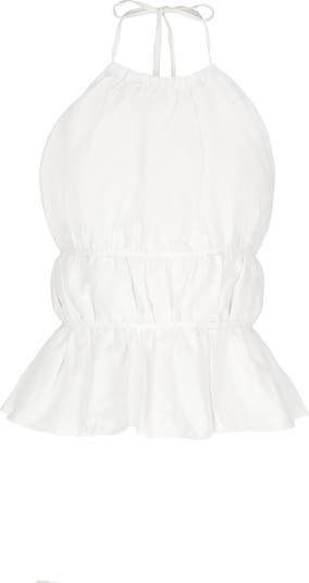 Halter top with a gathered neckline, tie-back closure, and ruched detailing. Features a tiered design with a flared peplum hem for a light, airy silhouette