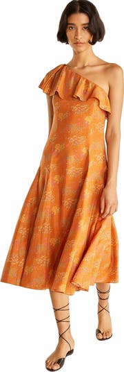 - A silk, ruffled one-shoulder dress is slim in the waist and falls into a fuller skirt.