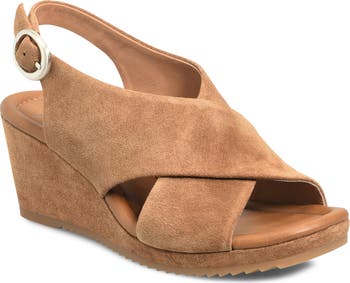 Wide, crisscrossing straps create stylish dimension on a slingback suede sandal grounded by a cushioned footbed and chunky wedge heel.
