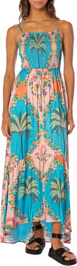 A smocked bodice perfects the fit of a breezy cover-up dress featuring a flowy high-low skirt with a tiered hem.
