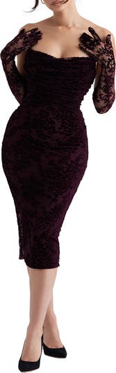 Feel supported in this strapless dress featuring velvety blooms on stretchy mesh and a built-in corset with matching gloves, boning and a powermesh lining.