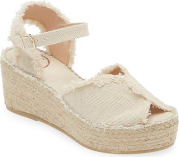 A woven platform and wedge heel underscore the espadrille-inspired style of this summery sandal finished with frayed trim.