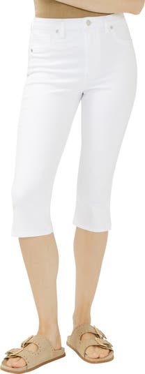 Stay comfy on sunny days in these stretchy denim capris made with an eased waist, slit hems and a fitted silhouette through the hips and thighs.