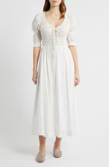The cult-favorite Cali label's retro/romantic aesthetic pervades every stitch of this breezy organic cotton–voile dress with a deep scoop neckline that can be styled seductively off the shoulders. Ruffles, shirring and double-puffed sleeves further the enchanting character of this popular style.