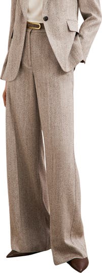 A herringbone pattern adds texture and polish to these high-waist pants punctuated with drapey wide legs.