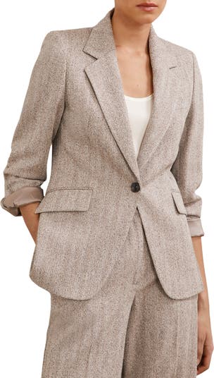 A textured herringbone pattern enhances the polish of this tailored one-button jacket.