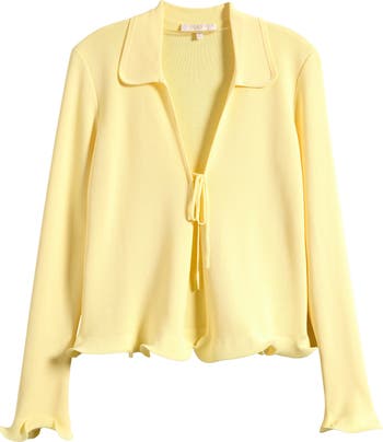 A spread collar and slender front ties frame this playfully ruffled cardigan that perfectly merges sweet style with easy-wear comfort.