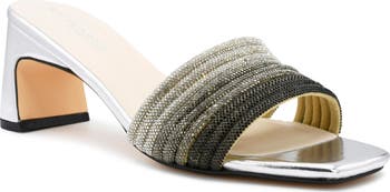 Rows of lustrous rhinestones create an ombré effect at the vamp of a glam slide sandal lifted by a sculptural metallic heel.