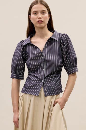 Soft ruching at the side seams shapes this crisp yarn-dyed poplin shirt, finished with shell buttons for an elevated take on a classic silhouette.