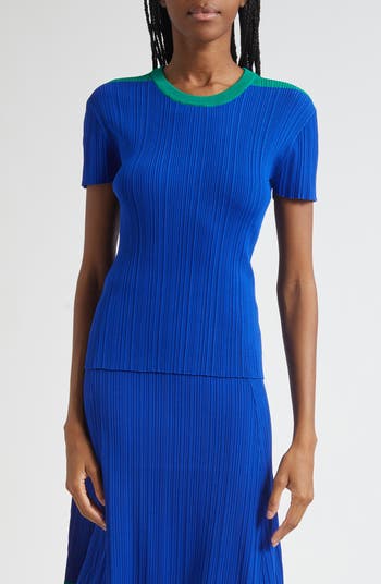 Colorblocked shoulders and a contrast collar bring retro allure to this sweater rib-knit from a silky blend.