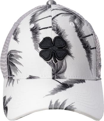 - • Performance Polyester Blends + Super Breathable Mesh Back • White/Black Tropical Print Hat • Grey Mesh Back • 3D Black Clover