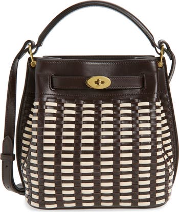 A signature Postman's Lock secures the wraparound belt on this beautifully structured bucket bag updated with a two-tone woven-leather design. A padded top handle and removable, adjustable strap offer carrying options for any occasion.