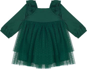 Step into the holidays with the Mistletoe Dress in emerald green. This toddler dress features a layered tulle skirt with dotted print, ruffled shoulder accents, a square neckline, and long puff sleeves with rolled cuffs. Short sharkbite hem adds playful movement, perfect for festive occasions. Machine wash cold, line dry, do not bleach.
