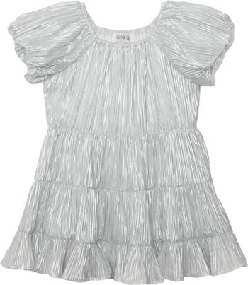 Make any occasion shimmer with the Sparkle and Spin Silver Dress by Isobella and Chloe. This tiered dress features a crinkled metallic finish and glitter embellishment that catch the light as she twirls. Designed with gathered crew neckline, puff sleeves, lightweight fabric, and a playful sharkbite hem. Machine wash cold, line dry, do not bleach.