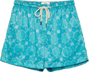 Peninsula swim shorts with Mediterranean style pattern. Two side pockets with contrasting interior and soft touch mesh lining. Meticulous attention to detail and timeless elegance make this product one of a kind.