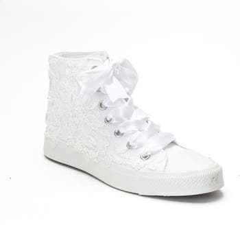 A romantic bridal high-top sneaker featuring intricate ivory floral lace and subtle pearl embellishments. Finished with satin ribbon laces and a cushioned insole, this lightweight design offers timeless elegance and modern comfort for weddings.