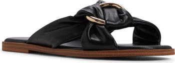 Circular hardware centers the gathered faux-leather straps on a versatile slide sandal featuring a dual-density foam footbed for daylong comfort.