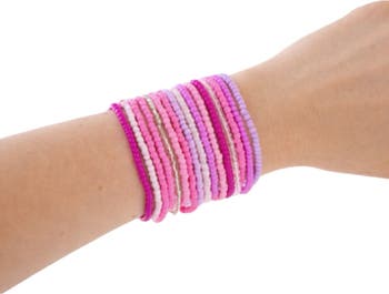 This vibrant stack of stretch bracelets features smooth, lightweight beads in layered shades of pink, magenta, blush, and soft lilac. Designed to be worn together or mixed and matched, each bracelet adds a playful pop of color while still feeling effortless and wearable.