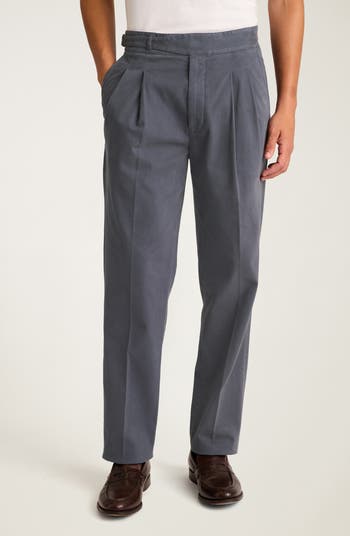 An attached quarter-length belt ensures an ideal fit, sleek tucked-in styling and one less thing to search for when getting dressed in the morning with these pleat-front pants made from Italian stretch cotton.