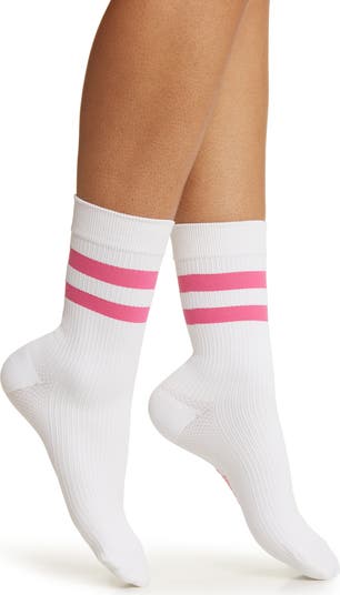 Playful stripes grace the ribbed shaft of these soft compression socks designed to promote circulation and energize your stride in moisture-wicking comfort.