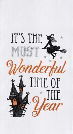 - Handcrafted embroidered kitchen towel with a spooky Halloween-themed needlework.