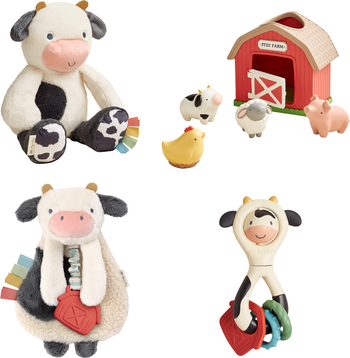 - Carmen the Cow- Our snuggly Itzy Lovey features soft fabric and textured ribbons that baby will love to explore! A textured silicone teether helps massage and soothe sore gums, and crinkly arms and legs are sure to keep baby entertained with their gentle sound! Sweetie Snuggles- Our iconic character, Carmen the Cow, brought to life in a soft, cuddly plush. Features multiple soft fabric textures and ribbons for sensory exploration and promotes self-soothing. The Itzy Spinner-Gentle rattle sounds and a spinning face are sure to captivate. The easy-grip handle turns and clicks keeping tiny hands busy. Soft ears and three clinking rings are textured to provide relief to sore gums! Itzy Play- Featuring a mini barn with hinged door and rooftop opening plus four soft, squeezy animals, your babe’s imagination will go through the roof as they explore put-and-take play, learn object permanence, and create endless storytelling adventures.