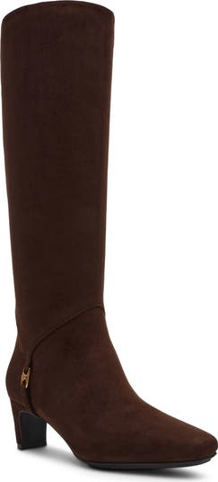 A flexible sole enhances the everyday comfort of a knee-high bootie embellished with subtle logo hardware.