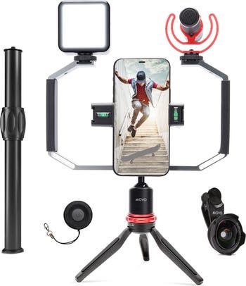 Transform your handheld videos with the Movo iVlog3 Smartphone Video Kit. The VXR10-PRO microphone captures crisp audio while cancelling out background noise, thanks to its supercardioid polar pattern. An included shock mount and foam windscreen further reduce interference. The SPR-5 smartphone cage features an adjustable holder that will accommodate devices up to 3.9 inches wide. The holder can rotate for vertical or horizontal shots, and features a pair of cold shoe mounts for easy attachment of accessories.For added stability, the accompanying hand grip can be swapped out for the MV-T1 Tripod, which comes with an extension pole for added height. To get wider angle shots, the SPL-WA 18mm lens can be clipped onto your phone’s camera. Illumination is provided by the LED-XS panel light. Finally, take selfies and video hands-free with the RC101 shutter remote. All included products include a free one-year warranty and friendly customer service based in the U.S.A.