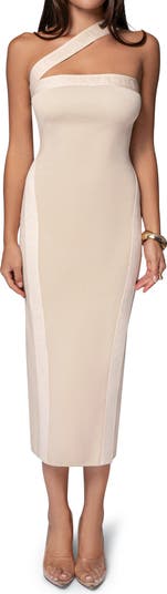 A sleek strap slashes across the neckline of this body-contouring maxi designed in a shoulder-baring silhouette.