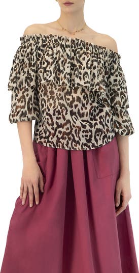 Animal print blouse with a bardot neckline and 3/4 sleeves