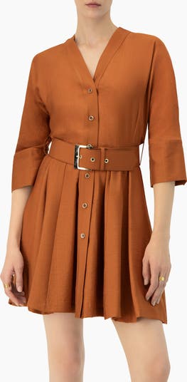 Short A-line dress with dolman sleeves, V-neckline, and belt
