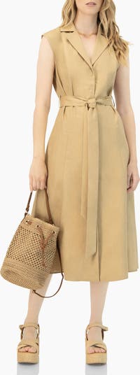 Elegant long linen dress featuring a waist tie and a lapel collar.