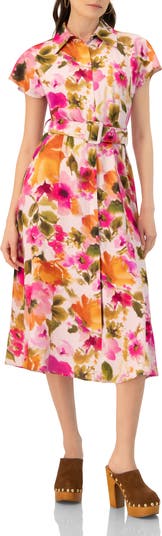IVONNE Midi Belted Floral Print Shirt Style Dress, Main, color, Multicolor-Pink