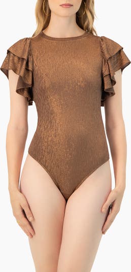 Sleek bodysuit featuring a round neckline and stylish ruffled sleeves.