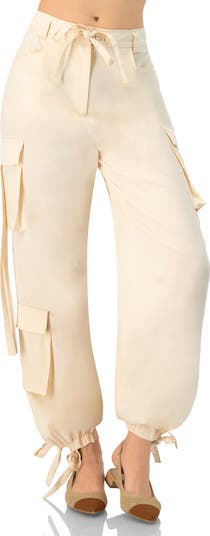 Solid cargo pants featuring adjustable straps at the waist, pockets, and ankles.