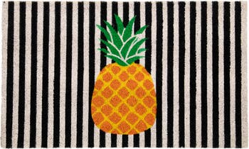 Welcome your guests in style with this charming pineapple doormat. The bright and bold black stripes, paired with the tropical orange pineapple design, add a pop of color and personality to your outdoor space. Made from all-natural coir fibers, this doormat is durable and weather-resistant, ensuring it can handle all kinds of outdoor elements. With its charming design and high-quality construction, this doormat is sure to impress your guests and make a statement at your front door. Product Features: Rectangular striped tropical doormat Printed with an orange, yellow and green pineapple Tufted and bleach printed mat Non-skid durable backing prevents slipping Heavy-duty and durable construction Coir is eco-friendly, resistant to fungi, resilient, static-free, fast drying and easy to clean Care instructions: sweep or lightly hose clean, air dry Recommended for indoor and outdoor use Dimensions: 0.75"H x 18"W x 30"L Material(s): coir/PVC