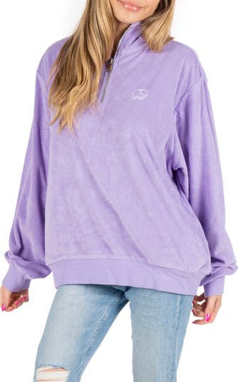 Get comfy in this slouchy quarter-zip sweatshirt crafted from a soft, brushed-back terry knit with an embroidered elephant at the chest.